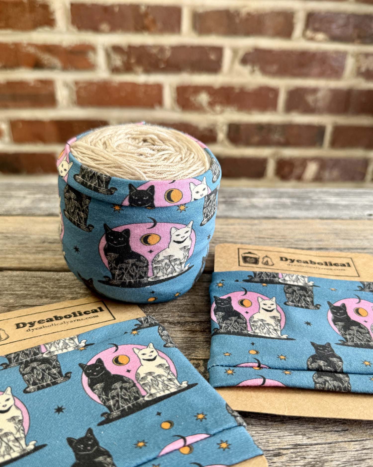 To use: Slide the yarn sock over your hand and grab the top of the cake. Slide the yarn sleeve down over the yarn.