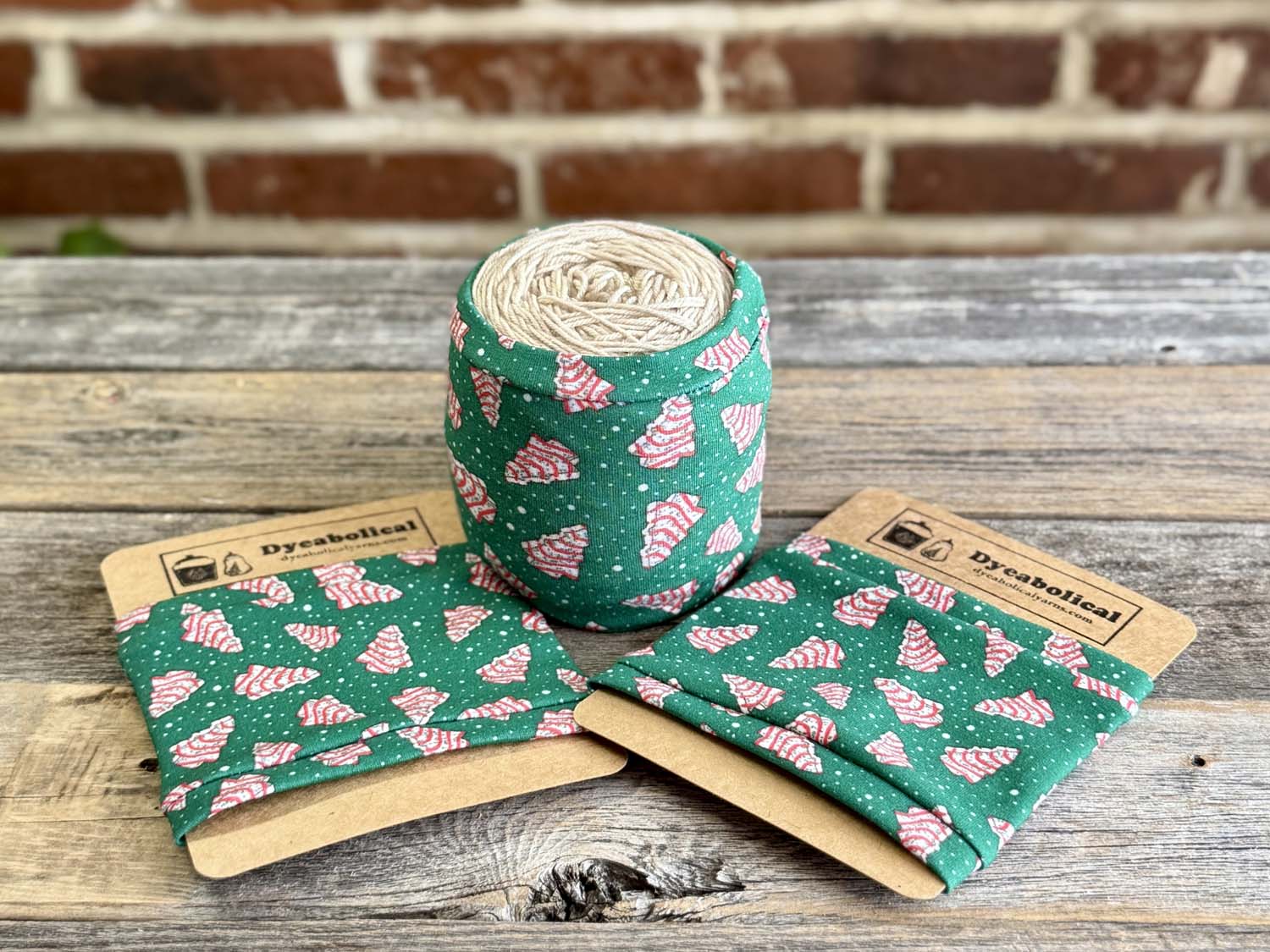 To use: Slide the yarn sock over your hand and grab the top of the cake. Slide the yarn sleeve down over the yarn.