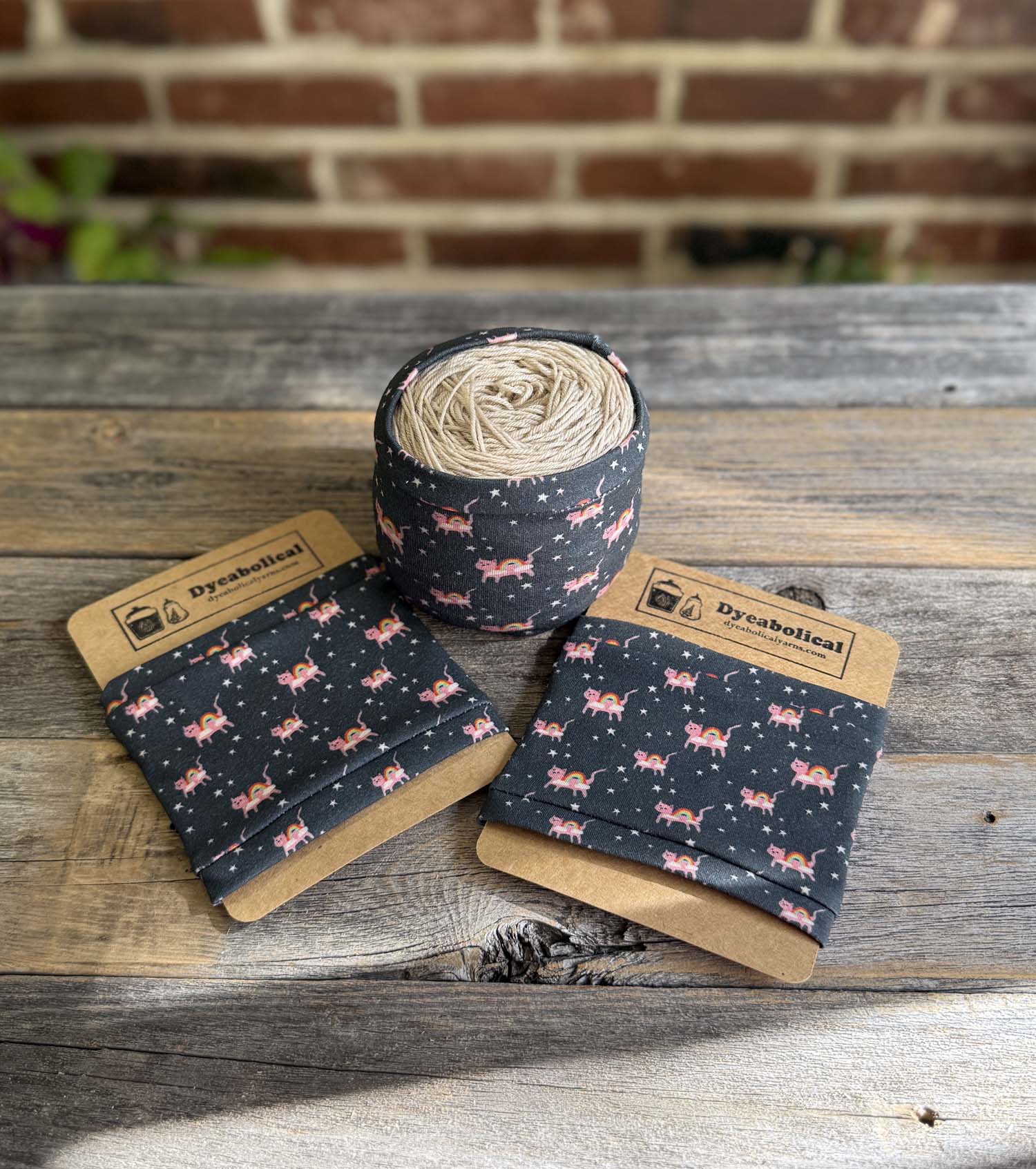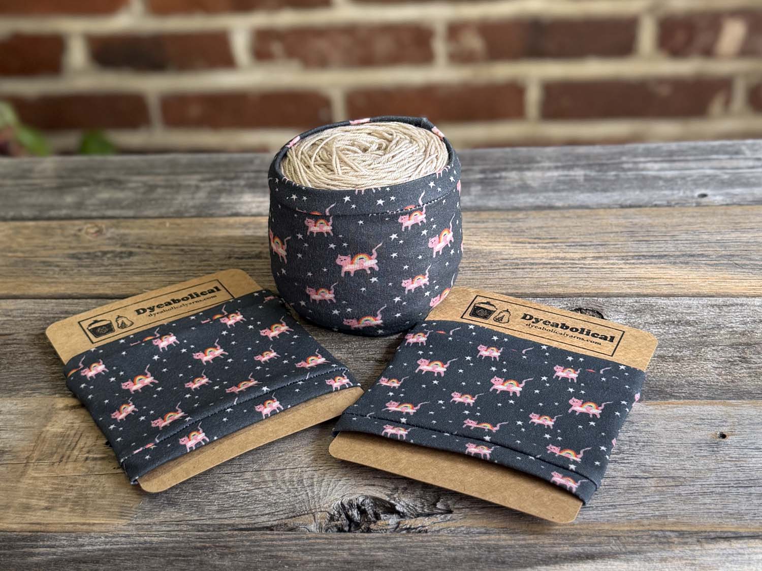 To use: Slide the yarn sock over your hand and grab the top of the cake. Slide the yarn sleeve down over the yarn.