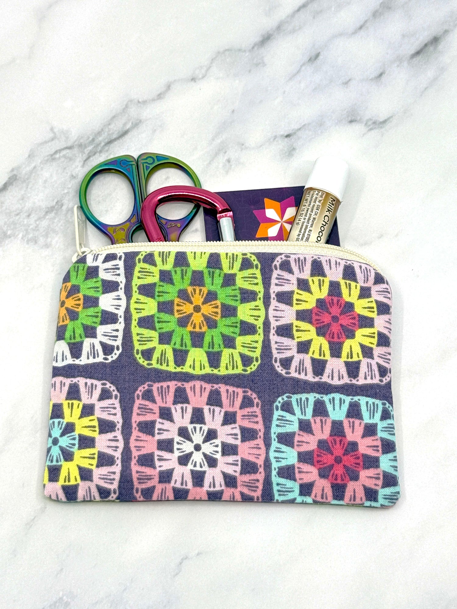 This small zip pouch is just the right size to use as a wallet, coin purse, notions pouch, gift card holder, etc. It is sized to hold multiple cards, keys, and/or earbuds easily. I use a mini pouch to hold a first aid kit and another to hold an emergency sewing kit in my purse, plus another one to hold knitting notions in my project bag.